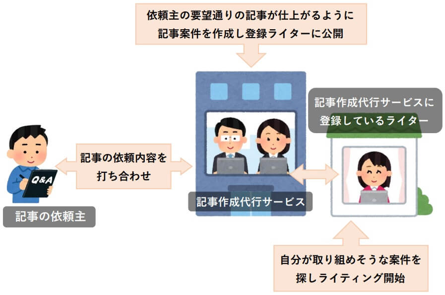 記事作成代行業者にはその業者に登録しているライターさんがいます。あなたが記事ライティングの依頼をすると、ライティング代行業者が案件内容をまとめ、代行業者に登録しているライターさんが閲覧できる「案件公開ページ」で案件を配信します。それを見た登録ライターが案件を選び、ライティングに取り掛かるというシステムです。